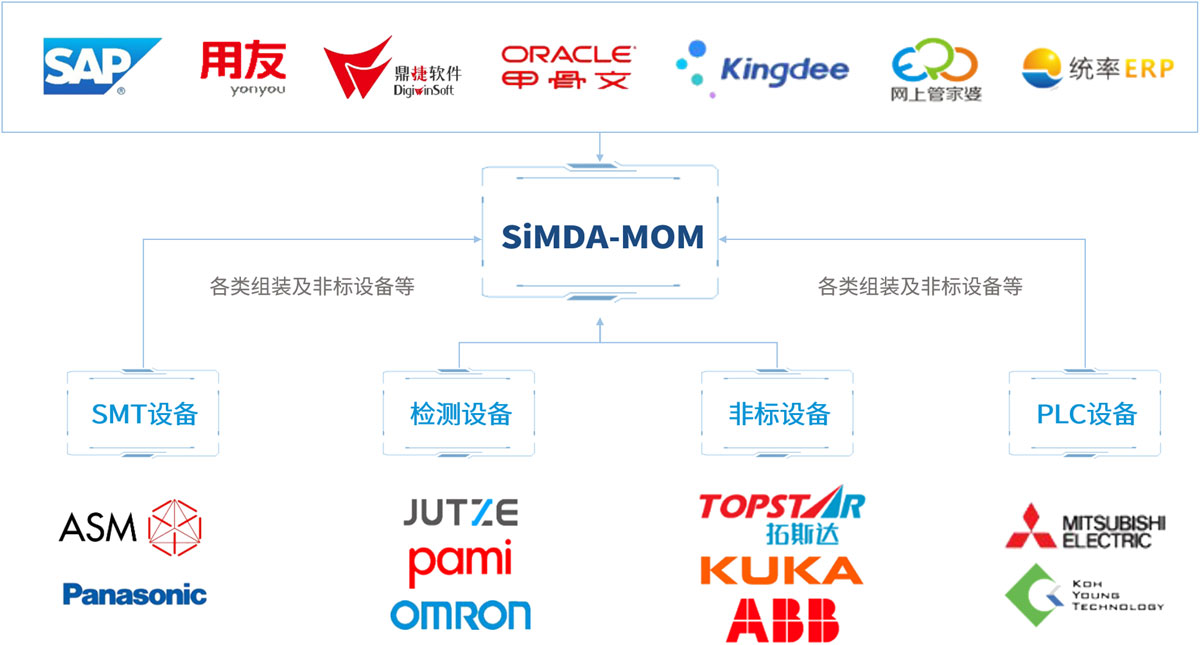 • 設(shè)備對(duì)接:SiMDA系列系統(tǒng)已成功對(duì)接電子裝配行業(yè)、機(jī)加工行業(yè)等多種行業(yè)生產(chǎn)設(shè)備,如SMT設(shè)備、DIP設(shè)備、PCB設(shè)備、組裝設(shè)備、測(cè)試設(shè)備以及非標(biāo)設(shè)備等。
