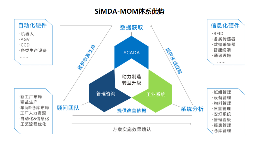 • SiMDA-MOM體系涵蓋:智能制造執(zhí)行系統(tǒng)(SiMDA-MES)、智能倉儲(chǔ)管理系統(tǒng)(SiMDA-WMS)數(shù)據(jù)采集系統(tǒng)(SiMDA-SCADA)數(shù)字化轉(zhuǎn)型輔導(dǎo)等產(chǎn)品和行業(yè)解決方案,有助于優(yōu)化制造運(yùn)營(yíng)管理流程,提高企業(yè)市場(chǎng)核心競(jìng)爭(zhēng)力。